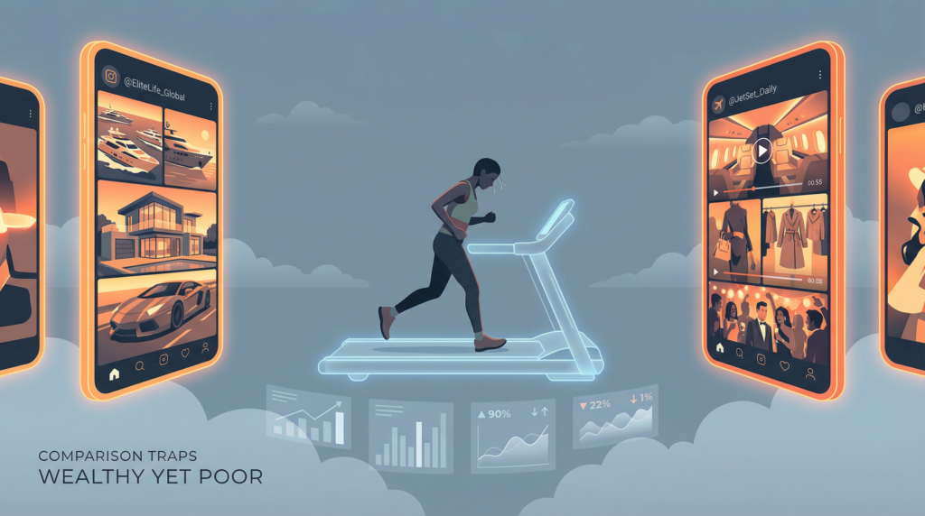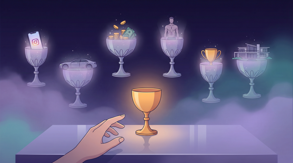 Nghe quen không? Này thì Instagram, này thì TikTok, này thì chuyện bạn-của-bạn ở Goldman Sachs, này thì biệt thự Beckham, này thì “triệu phú trước 30” — mỗi cái là một chiếc cốc lấp lánh treo lơ lửng. Nhìn cái nào cũng muốn. Chọn cái nào cũng sợ sai. Đứng nhìn cả bảy thì tê liệt.