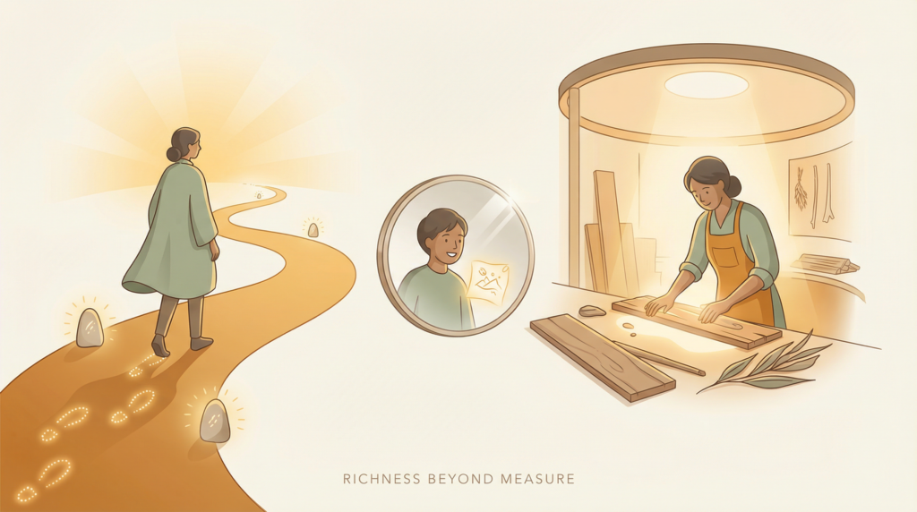 Chiêu cuối cùng là chuyện yêu cái quá trình. Jeff Bezos đâu đó nói rằng nếu bạn thích được một nửa công việc của mình, đó đã là tuyệt vời. Một nửa thôi. Không ai yêu 100% — kể cả Bezos chắc cũng ghét mấy cái cuộc họp hội đồng quản trị. Nhưng nửa kia, cái nửa bạn thật sự khoái, cái nửa khiến bạn quên giờ — đó mới là thứ làm cuộc sống giàu lên theo nghĩa không đo bằng tiền.