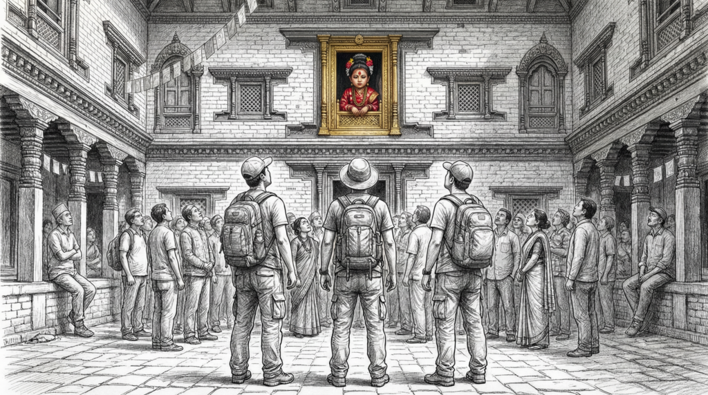 Kathmandu Durbar Square không phải là điểm đến xa lạ — UNESCO đã xếp hạng di sản thế giới cho nó từ năm 1979. Nhưng đứng trong cái sân gạch đó, ngước nhìn lên những ô cửa sổ chạm khắc tinh xảo theo kiến trúc Newari truyền thống, chờ một khuôn mặt nhỏ xuất hiện — đó là một thứ trải nghiệm không thể mua được bằng giá vé vào cổng.