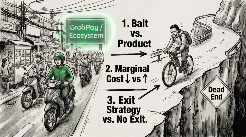 Trong đợt thanh lọc nền tảng ở Đông Nam Á, ai sống sót? Không phải ai đốt tiền nhiều nhất. Mà là ai mua được tài sản cấu trúc (structural asset) bằng tiền trợ cấp. Grab mua được mạng lưới tài xế + hệ thống thanh toán. Shopee mua được mối quan hệ với người bán + dữ liệu hành vi mua sắm. Những thứ đó không biến mất khi ngừng khuyến mãi.