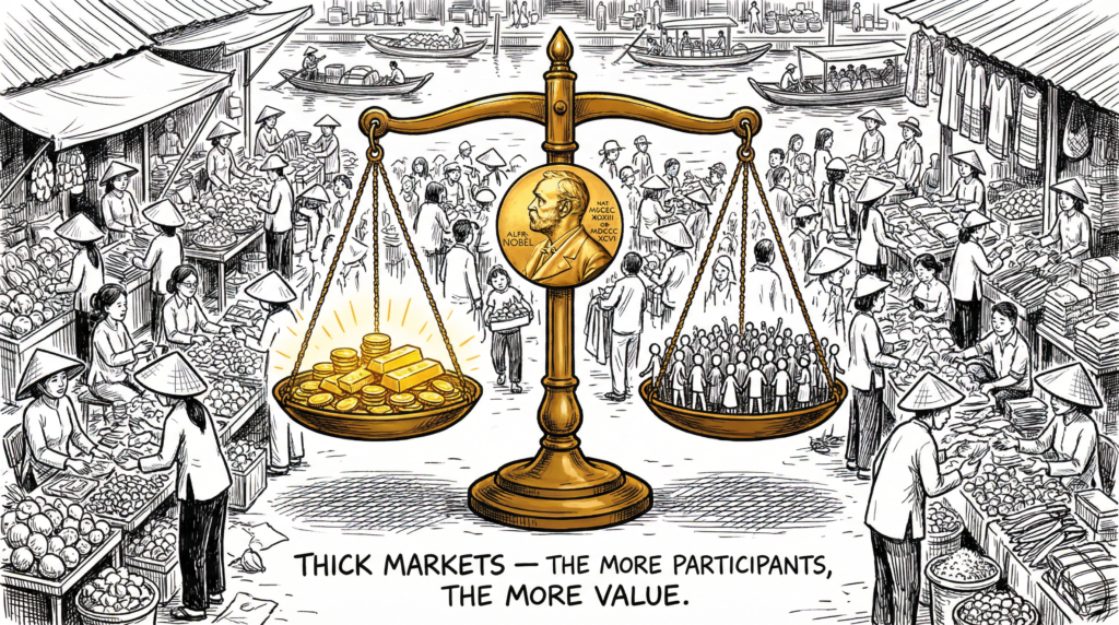 Alvin Roth — ông Nobel Kinh tế 2012 với cuốn Who Gets What – and Why (rất hay và không quá khó đọc) – có một nhận xét cực kỳ đơn giản mà nhiều người bỏ qua: một thị trường chỉ hoạt động được khi nó đủ “dày” (thick). Nghĩa là phải có đủ người mua và người bán cùng hiện diện, cùng lúc, cùng chỗ, để các giao dịch có ý nghĩa xảy ra.