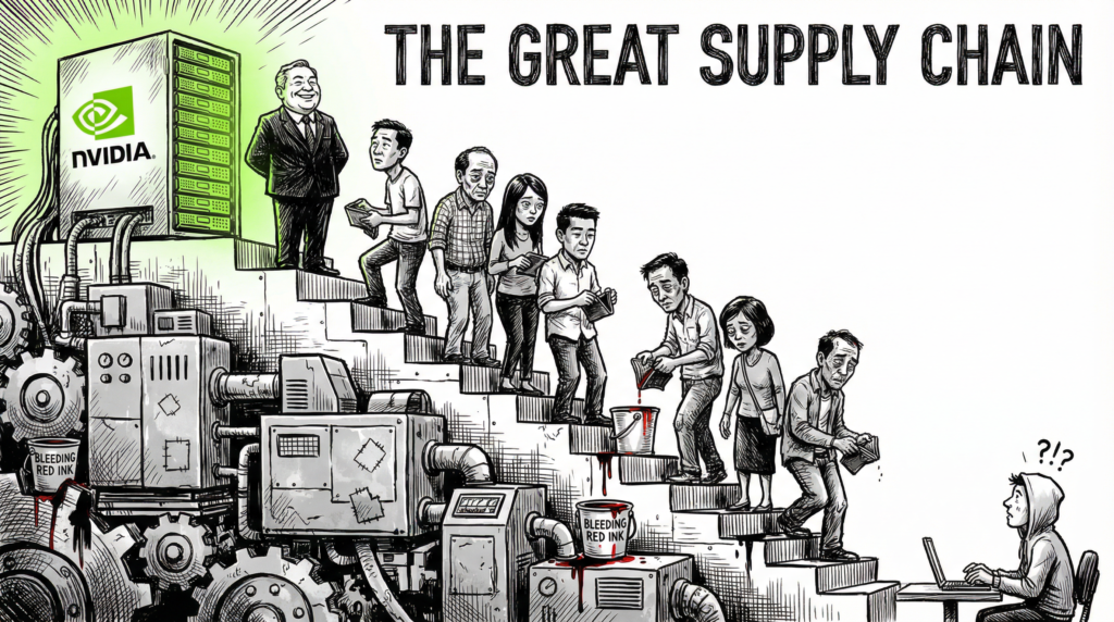 NVIDIA bán GPU cho trung tâm dữ liệu. Trung tâm dữ liệu cho thuê GPU cho các phòng thí nghiệm AI. Phòng thí nghiệm AI bán quyền truy cập mô hình cho các startup AI. Startup AI bán thuê bao cho người dùng cuối. Mỗi mắt xích đều lỗ — trừ NVIDIA.
