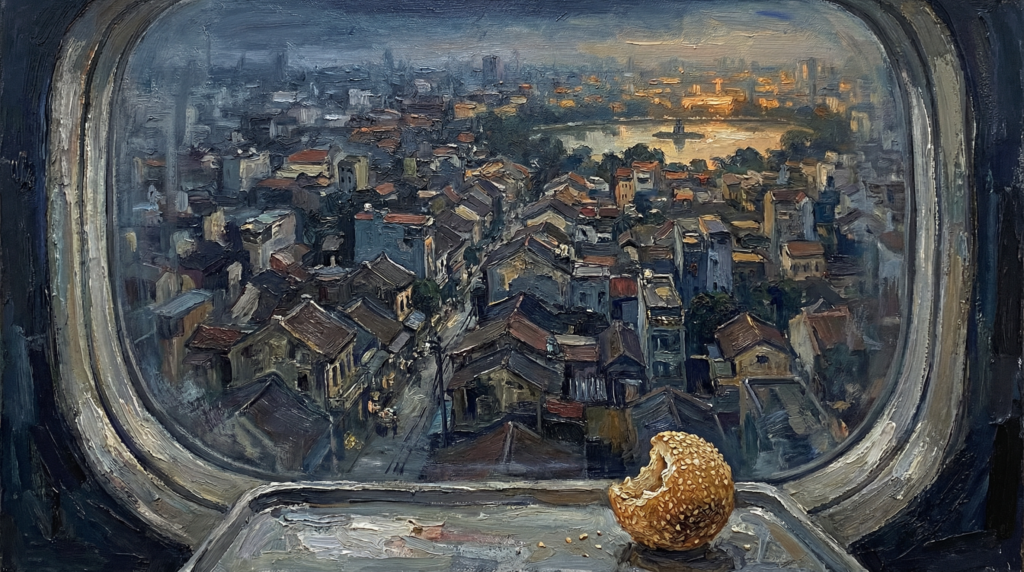 Mình sẽ về lại. Sáu giờ sáng, bát phở. Chín giờ, ổ bánh mì, cốc cà phê trứng. Mười một giờ, bát bún thang nếu may mắn gặp quán mở. Hai giờ chiều, bún ốc — nóng nếu trời lạnh, nguội nếu trời nóng. Bốn giờ, mấy cái bánh rán mật cầm tay ra sân bay. Sáu giờ tối, máy bay cất cánh, Hà Nội nhỏ dần dưới cánh.