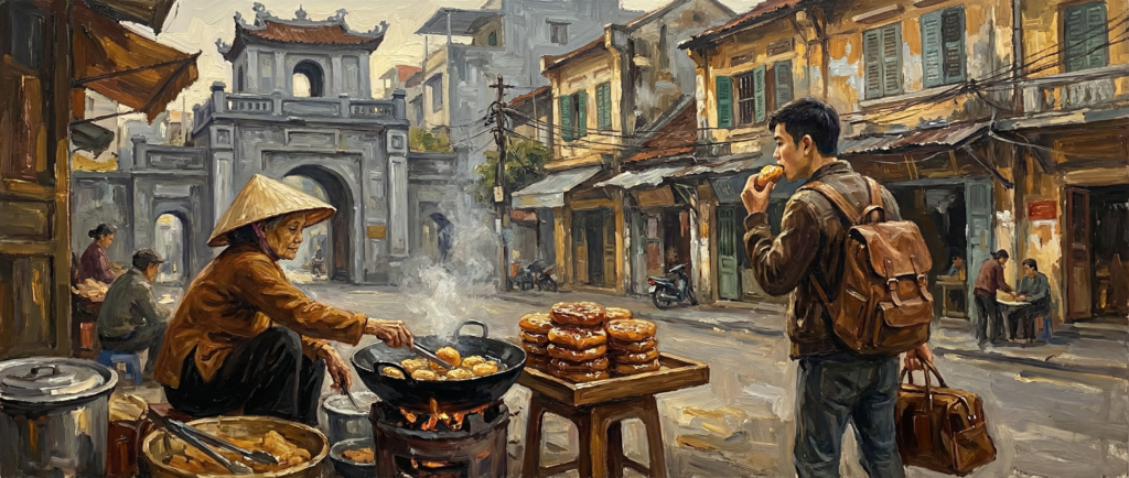 Rồi, gần cuối ngày, trước khi ra sân bay, mình ghé mua mấy cái bánh rán mật. Ba nghìn đồng một chiếc ở 52 Hàng Chiếu — ngay cạnh Ô Quan Chưởng, cái cửa ô cuối cùng của thành cổ Hà Nội.