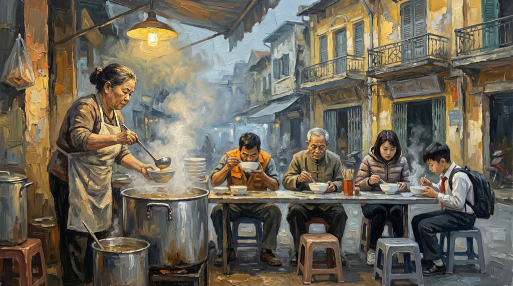 Nói tới đây lại nhớ một chuyện vui: phở không phải “của” Hà Nội. Làng Vân Cù, Nam Định, có gia phả nghề phở, có bí quyết truyền đời, có người gánh phở lên Hà Nội bán từ đầu thế kỷ XX. Mô hình y hệt thợ bạc Châu Khê lên phố Hàng Bạc — kỹ năng từ tỉnh, thị trường tại kinh đô. Nhưng rồi Hà Nội tinh chế, gán nhãn, và quên nguồn gốc. Hỏi một người Hà Nội “phở có phải từ Nam Định không?” — bạn sẽ thấy phản ứng phòng thủ nhanh hơn cả phản xạ tránh xe máy trên phố Hàng Bông.