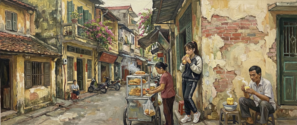 Không phải vì bận. Bận thì ai chẳng bận. Mà vì Hà Nội, ở một mức nào đó rất khó giải thích với người chưa sống ở đấy, là thành phố mà mình vừa nhớ kinh khủng vừa chịu không nổi. Cái không khí đặc quánh — theo đúng nghĩa đen: tháng ba tháng tư độ ẩm 98%, hít một hơi thấy phổi uống nước. Và theo nghĩa bóng: cái cách mà mọi thứ ở đấy cứ quện vào nhau — tiếng còi xe, mùi nước thải, mùi bún ốc, tiếng bà hàng nước chửi nhau với ông xe ôm — tất cả trộn thành một thứ sệt sệt, không có khoảng trống.