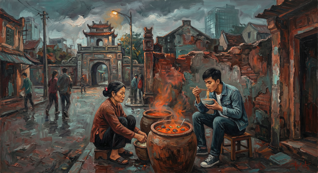Vũ Bằng viết về bún ốc từ Sài Gòn — xa Hà Nội — và viết hay hơn bất kỳ ai ngồi ở Hà Nội viết. Nguyễn Tuân viết về phở từ Helsinki — xa Hà Nội nửa vòng trái đất — và phong thánh cho nó bằng “ngàn năm văn vật.” Có lẽ Hà Nội là thành phố ngon nhất khi bạn không ở đó. Khoảng cách là gia vị cuối cùng — thứ mà không quán nào bán, không bà hàng nào nêm, nhưng thiếu nó thì bát nào cũng nhạt.