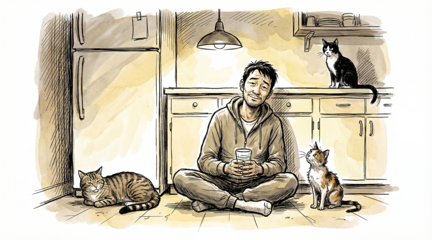 Mình ngồi xuống uống nước, nhìn ba con mèo, rồi tự hỏi: ông gần 50 rồi, sống một mình với ba con mèo, dậy lúc 3 giờ sáng vì khát nước — ông có ổn không?