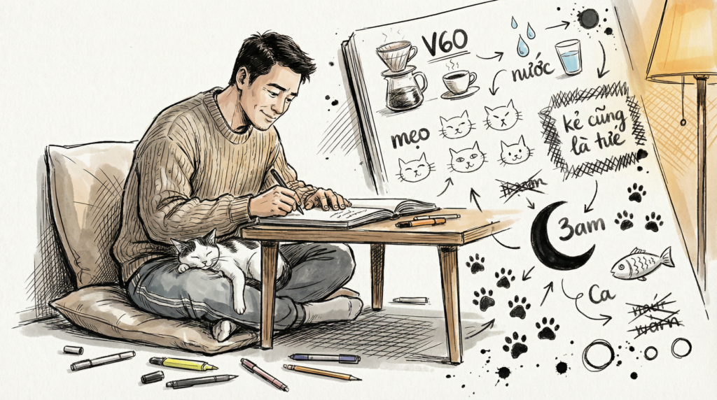 Sáng dậy, đun nước. Pha cà phê bằng V60 — cái filter paper, cái cân, cái ấm rót cổ ngỗng. Mất 7 phút. Trong 7 phút đó không sờ điện thoại. Con mướp ngồi trên bàn bếp nhìn mình rót nước theo vòng tròn. Nó không hiểu mình đang làm gì, nhưng cái nhịp đều đặn đó — đun, xay, rót, chờ — nó giống một bài thiền mà không cần ngồi xếp bằng.