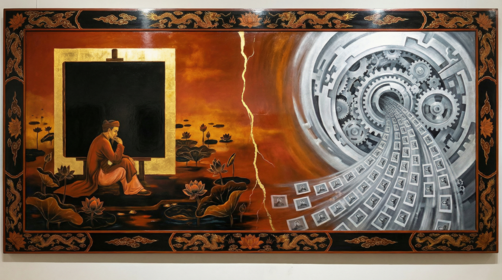 Không phải 8 giây hay 10 giây. Không phải gõ prompt rồi nhận output. Mà là đau — cái đau của người ngồi trước toan trắng, biết mình muốn gì nhưng chưa biết làm sao, tự xóa đi vẽ lại, tự cãi với chính mình cho đến khi thứ hiện ra trên mặt toan là thứ chưa từng tồn tại trước đó.