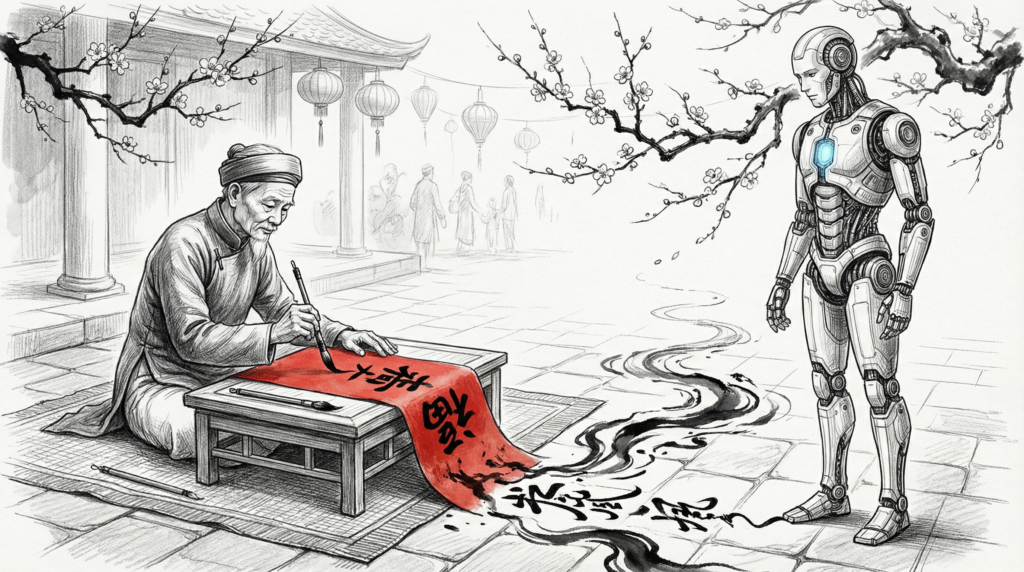 Hình ảnh ông đồ ngồi viết thư pháp trong những ngày Tết là một ẩn dụ hoàn hảo và cũng là một lời cảnh báo. Ông đồ không biến mất — ông vẫn ngồi đó, bút lông, mực tàu, giấy đỏ. Nhưng ông chỉ còn được trân trọng như một nghi lễ theo mùa, không còn là một phần của cuộc sống hàng ngày. Người ta xếp hàng chụp ảnh với ông không phải vì họ cần một câu đối — mà vì họ cần chứng minh rằng họ vẫn còn nhớ đến điều đó tồn tại.