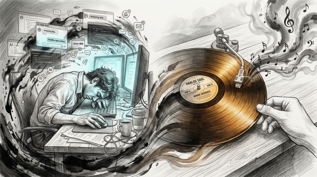 Bây giờ chiếu sang AI. Nếu MP3 là AI, thì đĩa than chính là nỗi hoài nhớ về quá trình con người tạo ra. Nhưng đây là chỗ mà phép loại suy bắt đầu vỡ: MP3 chưa bao giờ tự tạo ra nhạc. Nó chỉ là phương tiện phân phối. AI, ngược lại, đang ở trong vị trí của cả đĩa than lẫn người nghệ sĩ — và điều đó khiến mọi thứ trở nên không thể so sánh được. Khi AI có thể tự viết bản nhạc, thiết kế album art, và tạo ra giọng hát tổng hợp, thì cái gì sẽ đóng vai trò “đĩa than” của 20 năm tới? Liệu chính bàn tay con người có trở thành thứ xa xỉ phẩm như đĩa than hiện nay?