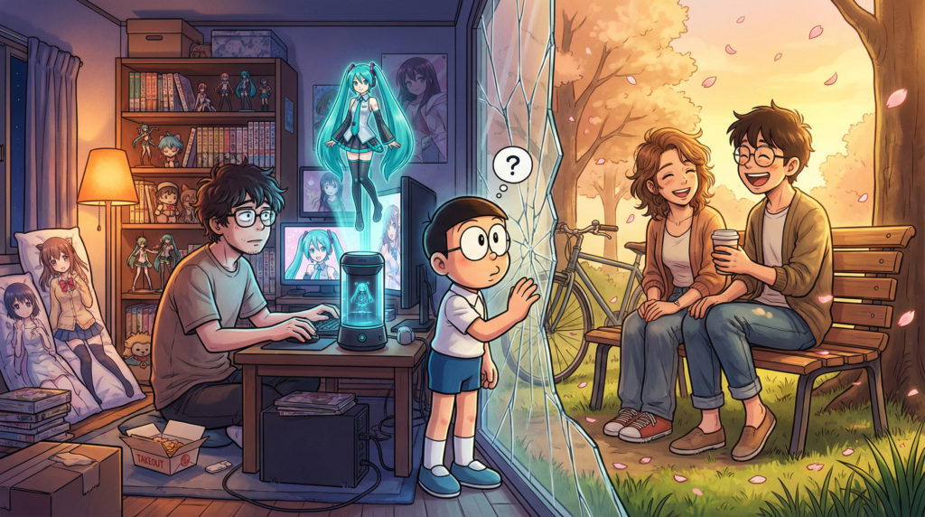Bây giờ thay “heroin” bằng “Hatsune Miku.” Thay “kim tiêm” bằng “body pillow.” Thay “crack pipe” bằng “Replika premium subscription.” Cơ chế tâm lý y hệt: con người tìm kiếm thứ gì đó bên ngoài để bù đắp khoảng trống mà mối quan hệ thực đáng lẽ phải lấp đầy.