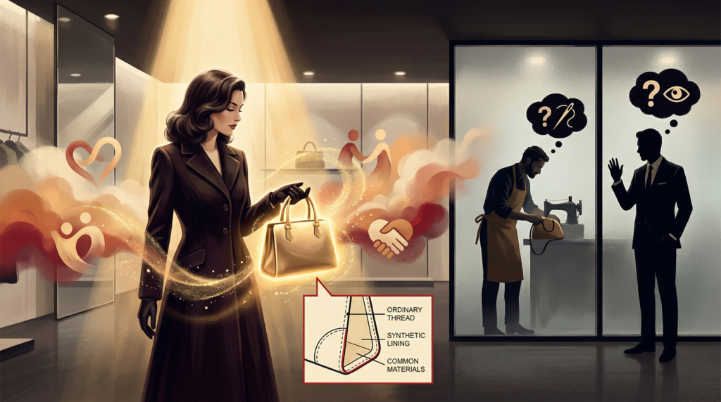 Sarah không thèm bán da bò nhái. Cô nắm thóp tâm lý học đầu sỏ: khách hàng nhắm mắt quẹt thẻ không vì chất lượng vật liệu, mà vì cảm giác được tha thứ cho sự bất an của chính họ. Boudoir chỉ là cái túi ráp bằng đồ rẻ tiền, nhưng câu chuyện về sự quý tộc, sự đặc quyền… một sự dối trá dệt bằng biểu đạt cá nhân lại đánh mạnh đến mức người mua tình nguyện đui mù để được chui vào lớp vỏ đó.