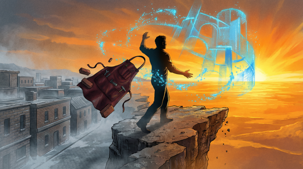 Năng lực thực thi, hay kỹ năng cứng (Craft), là vua. Bạn chả cần một tầm nhìn điên rồ, bạn chỉ cần code sạch hơn, quy trình gọn hơn, ra mắt tính năng nhanh hơn đối thủ nửa nhịp. Chừng đó là đủ để được vinh danh là một người thợ lão luyện. Bạn hãnh diện về những viên gạch tự tay nung. Rồi một ngày sáng ngủ dậy, AI táng thẳng vào mặt bạn cục code hoàn hảo chỉ sau ba dòng chửi thề gõ trên bàn phím.