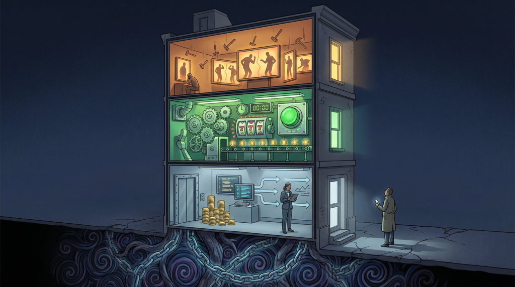Rồi lo âu đó chạy xuống tầng giữa. Nền tảng giao dịch không cần hỏi tại sao bạn mở app lúc 2 giờ sáng — chúng chỉ cần đảm bảo rằng khi bạn mở, mọi rào cản đều đã được dọn sạch. Không có tín hiệu dừng. Không có câu hỏi “bạn có chắc không?” Chỉ có một cái nút. Zheng Jie mô tả đây là bản chất của mọi đổi mới tài chính: xóa dần khoảng cách giữa ý kiến và hành động. Yu-kai Chou gọi đúng tên cơ chế bên trong: khan hiếm, sợ mất mát, phần thưởng ngẫu nhiên — bộ ba mũ đen cổ điển.