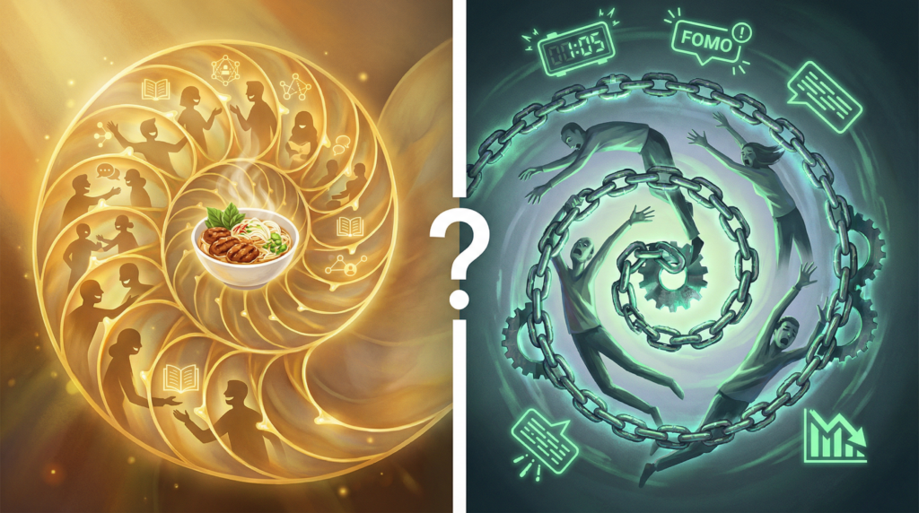 Vòng xoáy giả, hay nói thẳng hơn là phễu tiếp thị (marketing funnel) đội lốt, thì ngược lại: người dùng “chia sẻ” vì sợ, vì lo, vì tuyệt vọng. Không phải vốn xã hội (social currency). Là nợ xã hội (social debt).