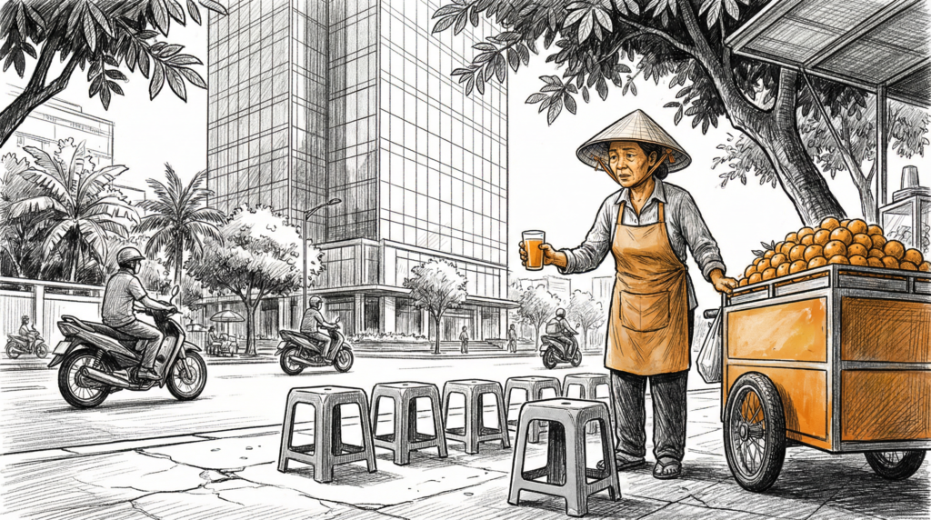 Gần công ty mình có một xe nước cam vắt ven đường, hai mươi nghìn một ly, ngon đến mức mấy năm rồi chưa thấy ai cạnh tranh nổi. Buổi trưa, mình hay kéo đồng nghiệp ra đó ngồi, uống ly cam, tám chuyện linh tinh mười lăm phút rồi quay lại làm. Cái ghế nhựa kê sát lề, nắng xiên qua tán cây, tiếng xe chạy ào ào phía sau. Không sang trọng gì nhưng nó là nghi thức giữa ngày.