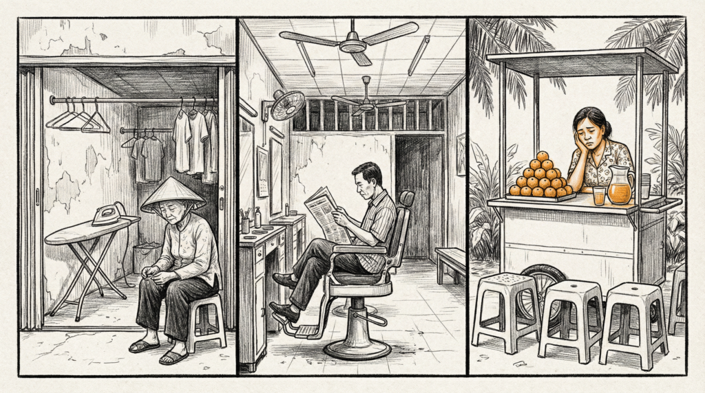 Tháng trước ghé, thấy vắng hơn bình thường. Không phải vắng kiểu mưa gió, mà vắng kiểu… ít mặt quen. Mấy anh chị bên bộ phận kế toán hay ngồi bàn kế bên biến đâu hết. Hỏi ra mới biết: công ty đối diện vừa cắt gọn phòng tài chính, ghép vào một cái phần mềm gì đó chạy tự động. Mười mấy người, thứ Sáu còn ngồi uống cam, thứ Hai đã dọn bàn.