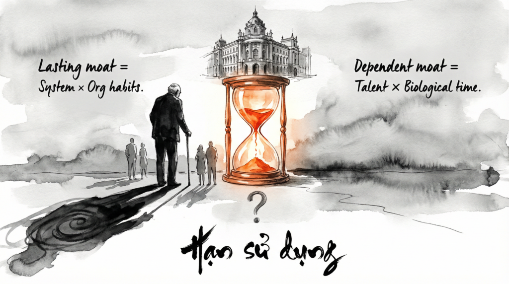 Lợi thế bền = Hệ thống × Thói quen tổ chức. Lợi thế phụ thuộc = Tài năng × Thời gian sinh học.