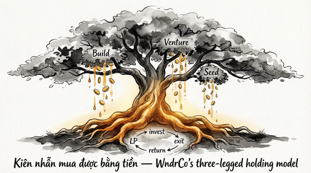 Ai từng làm trong hệ sinh thái tập đoàn Việt Nam sẽ thấy cấu trúc này quen. Masan, Vingroup — conglomerate dùng dòng tiền mảng bò sữa (cash cow) nuôi mảng tăng trưởng. Nhưng khác biệt quyết định: conglomerate Việt thường bù lỗ vertical yếu, giữ thị phần. WndrCo dùng tiền để mua thời gian cho bet tốt. Cùng cấu trúc, khác triết lý phân bổ vốn.