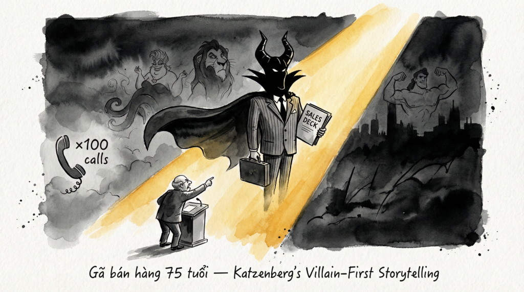 Framework yêu thích, mượn từ Walt Disney: “Phim của tôi chỉ hay bằng nhân vật phản diện.” Ursula. Gaston. Scar. Farquaad. Tai Lung. Ông liệt kê không cần dừng. Ý tưởng: không có villain rõ ràng, protagonist không có gì để vượt qua. Trong kinh doanh, villain là vấn đề sản phẩm giải quyết. Kể được villain đủ đáng sợ, người ta mới thèm nghe giải pháp.
