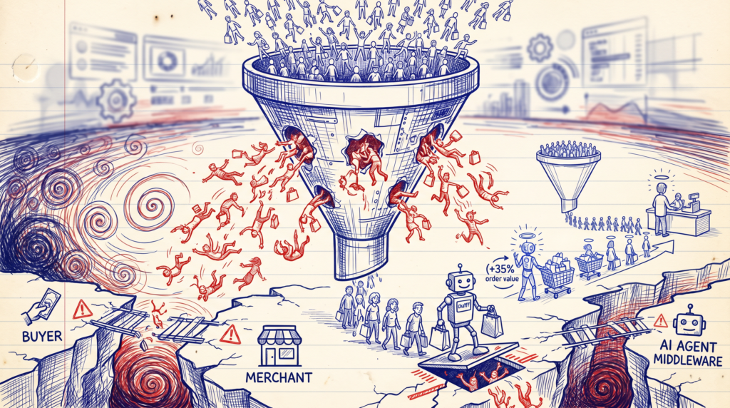 Để hiểu vì sao Walmart thất bại, cần tua lại 10 tháng. Simon Taylor, trưởng bộ phận chiến lược tại công ty chống gian lận Sardine và tác giả bản tin Fintech Brainfood, viết vào tháng 5/2025 rằng “quầy thanh toán đã chết.” Ông không nói bóng gió. Ông nói thẳng: AI agent sẽ nén toàn bộ phễu mua hàng (khám phá, so sánh, quyết định, thanh toán) thành một cuộc hội thoại duy nhất, và cái nút “Mua ngay” sẽ trở nên thừa thãi như ổ đĩa mềm.