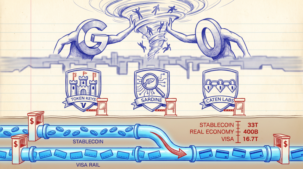 Lớp thứ hai: nhà cung cấp định danh agent. Visa muốn là lớp này bằng tokenization. Sardine muốn bằng Know Your Agent. Caten Labs muốn bằng Agent Credential Kit (chứng chỉ có thể xác minh trên blockchain). Ba framework mã hóa ba cấu trúc quyền lực khác nhau: Visa giữ quyền qua mạng thẻ, Sardine giữ quyền qua lớp chống gian lận, Caten Labs giữ quyền qua tiêu chuẩn mở. Ai thắng ở lớp này sẽ đánh thuế lên mọi giao dịch vô hình.