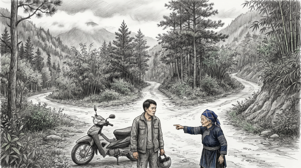 Cả hai đều nói thật. Không ai đùa, không ai muốn mình lạc lâu hơn. Bà cụ đi lại bằng chân, biết từng khúc đường theo bước chân — hai ngày là lịch trình chuẩn với đôi chân quen rừng. Còn anh kia tính theo bánh xe: đường trơn, thuộc lối, xe đủ máy thì hai tiếng là hợp lý.