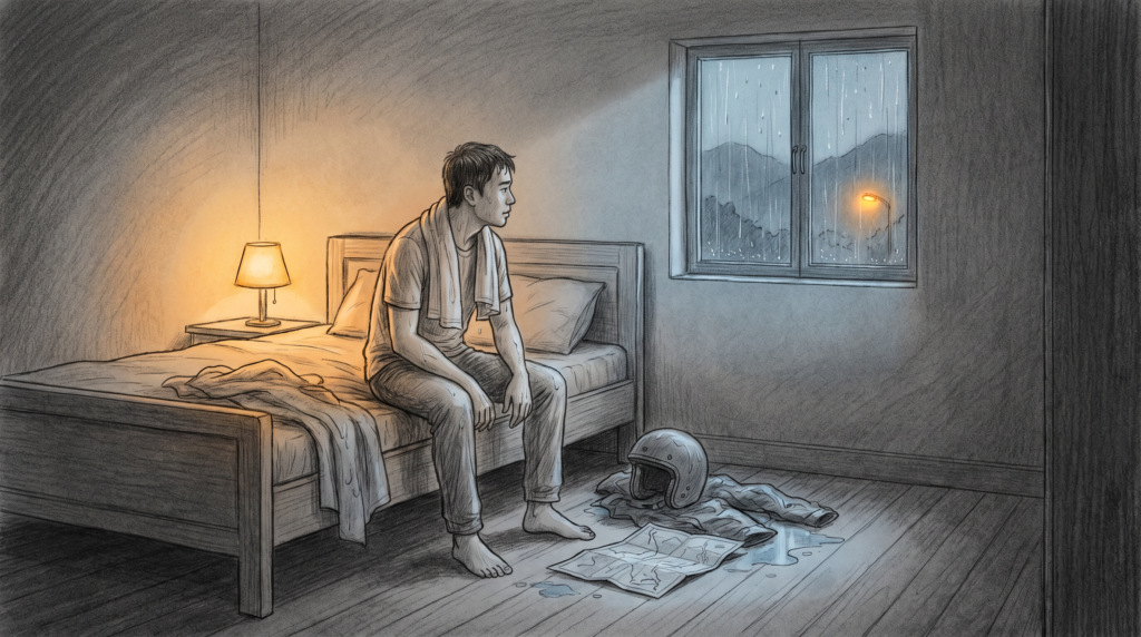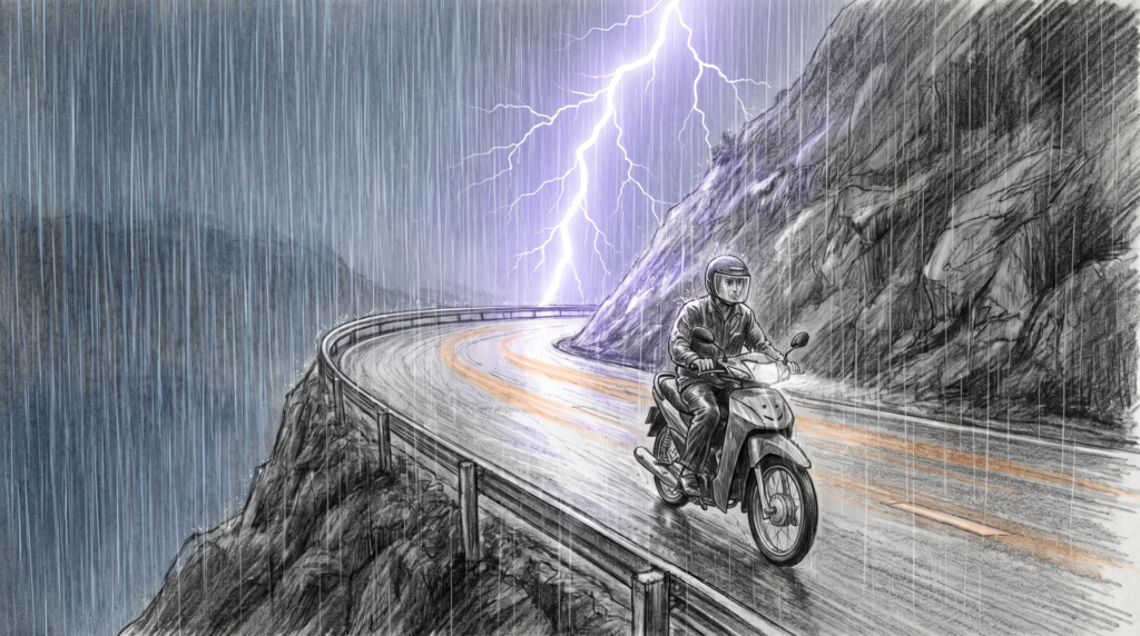 Mưa đập thẳng vào mặt. Kính mũ nhòe, không thấy đường, chỉ thấy một màn nước trắng xóa và ánh đèn pha từ xe ngược chiều loang ra như vệt dầu. Rồi sét đánh vào đâu đó gần lắm.