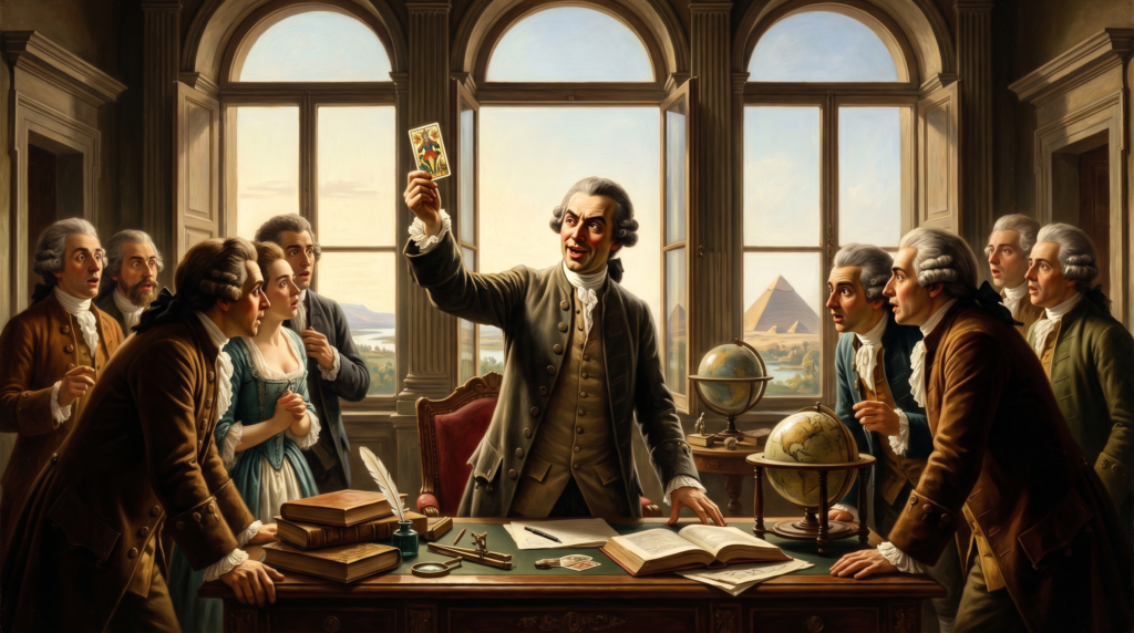 Vậy “nguồn gốc Ai Cập” từ đâu ra? Năm 1781, một học giả người Pháp tên là Antoine Court de Gébelin nhìn mấy lá bài, tự tin chém gió rằng từ “Tarot” bắt nguồn từ tiếng Ai Cập: Tar (con đường) và Ro (hoàng gia). Nghe rất kêu. Nghe rất cổ đại. Chỉ có một vấn đề: mãi đến tận năm 1799, người ta mới tìm ra phiến đá Rosetta để giải mã tiếng Ai Cập. Gébelin đơn giản là bịa tạc hoàn toàn dựa trên cơn sốt cuồng Ai Cập (Egyptomania) của Châu Âu lúc bấy giờ.