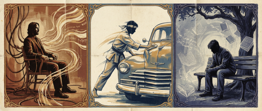 Keanu Reeves mở mắt, ngồi bật dậy trên ghế, thở hổn hển. Mười tiếng tải dữ liệu. Hàng chục chương trình chiến đấu bơm thẳng vào não qua cổng cắm sau gáy. Rồi anh nói một câu mà cả thế giới nhớ: “I know kung fu.” Morpheus không vỗ tay. Ông kéo Neo vào phòng…